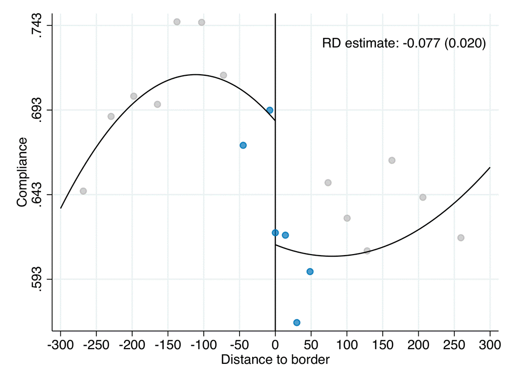 The city divides properties into 63 tax sectors, each with its own assessed land price per square meter. While this system simplifies tax administration – as it is easier to update coarse land data on 63 sectors than hundreds of thousands of land prices – it also generates inequities. Two nearly identical houses on opposite sides of a street boundary can face very different tax bills – which citizens notice. In fact, we find that compliance is about 8% lower on the side of the boundary where assessed values are higher.