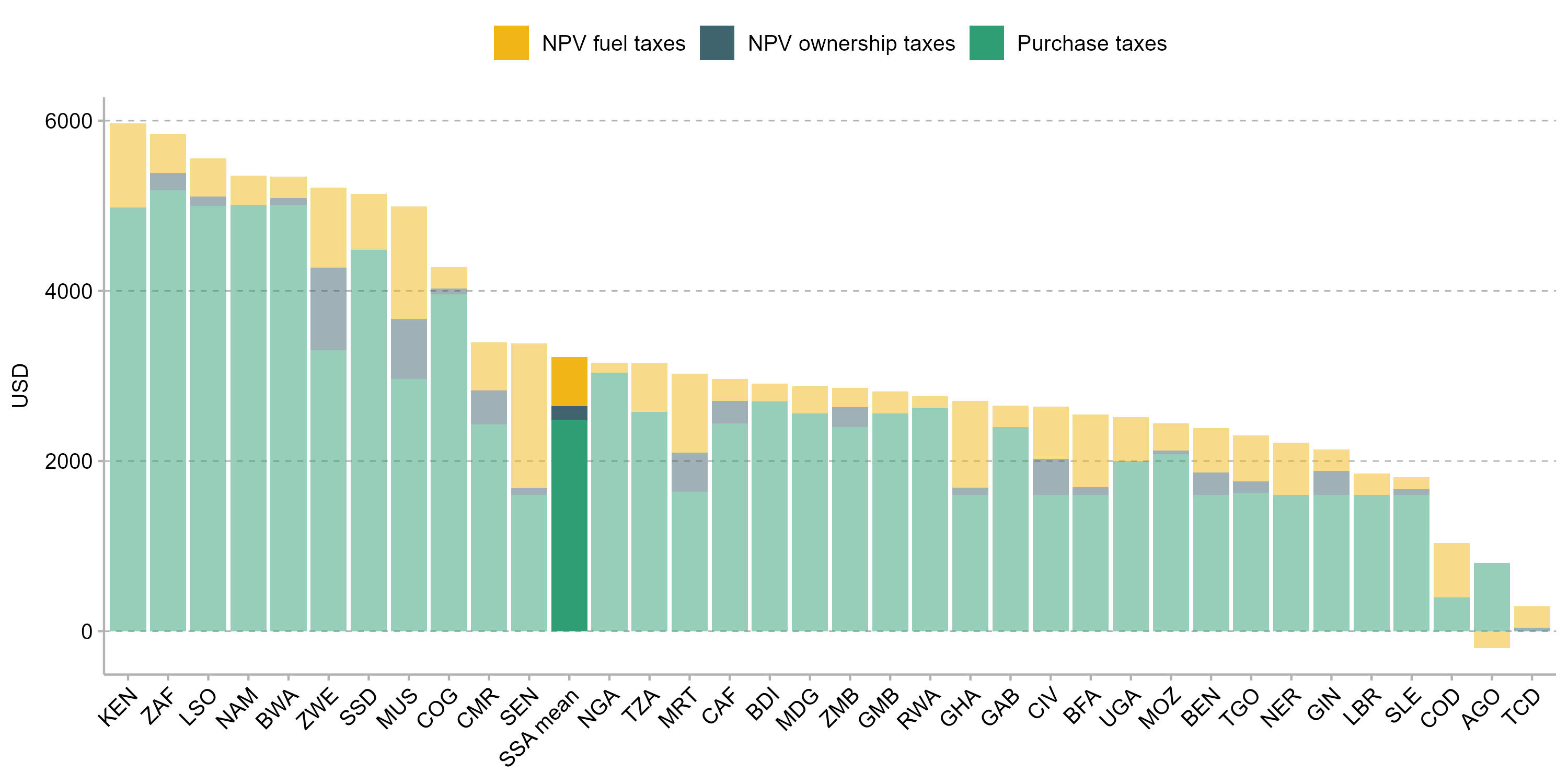 In most SSA countries, up-front purchase taxes make up a significant share of total taxes paid over the lifetime of the vehicle. Under these assumptions, the average lifetime tax in SSA on a vehicle worth $8,000 at import is $3,325.The majority of this is made up of vehicle purchase taxes ($2,482), with the remainder being the net present value of fuel taxes ($577) and the net present value of ownership taxes ($165).